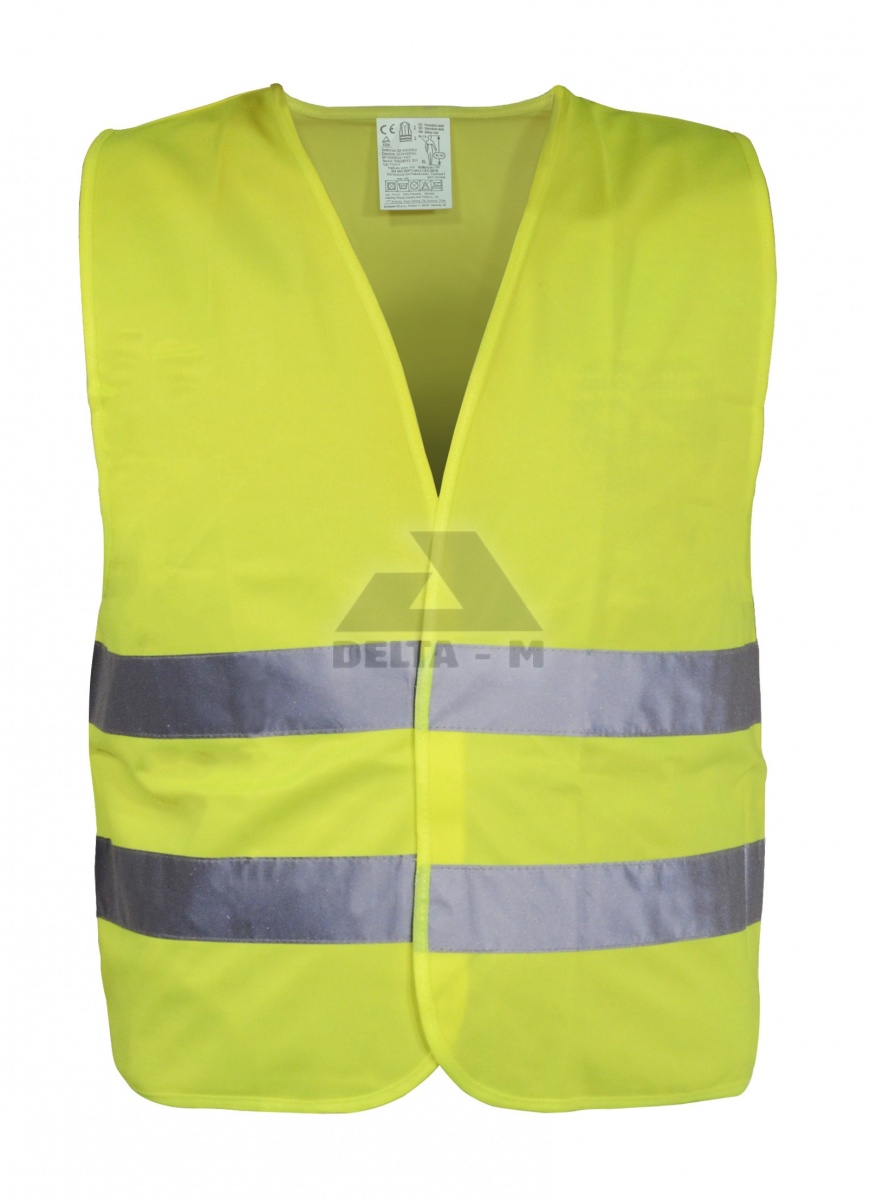 Výstražná reflexní vesta (ochranný oděv s vysokou viditelností) se zapínáním na suchý zip. Dva reflexní pruhy po celém obvodu, žlutá barva.