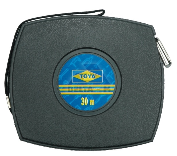 Ocelová páska dlouhá 10 m a široká 10 mm, zakončená kovovým „očkem“.